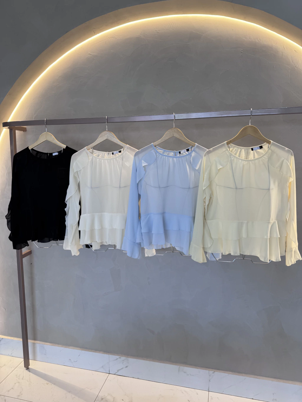 Blusa em tecido musseline. Modelo possui babado na barra e babado no braço.