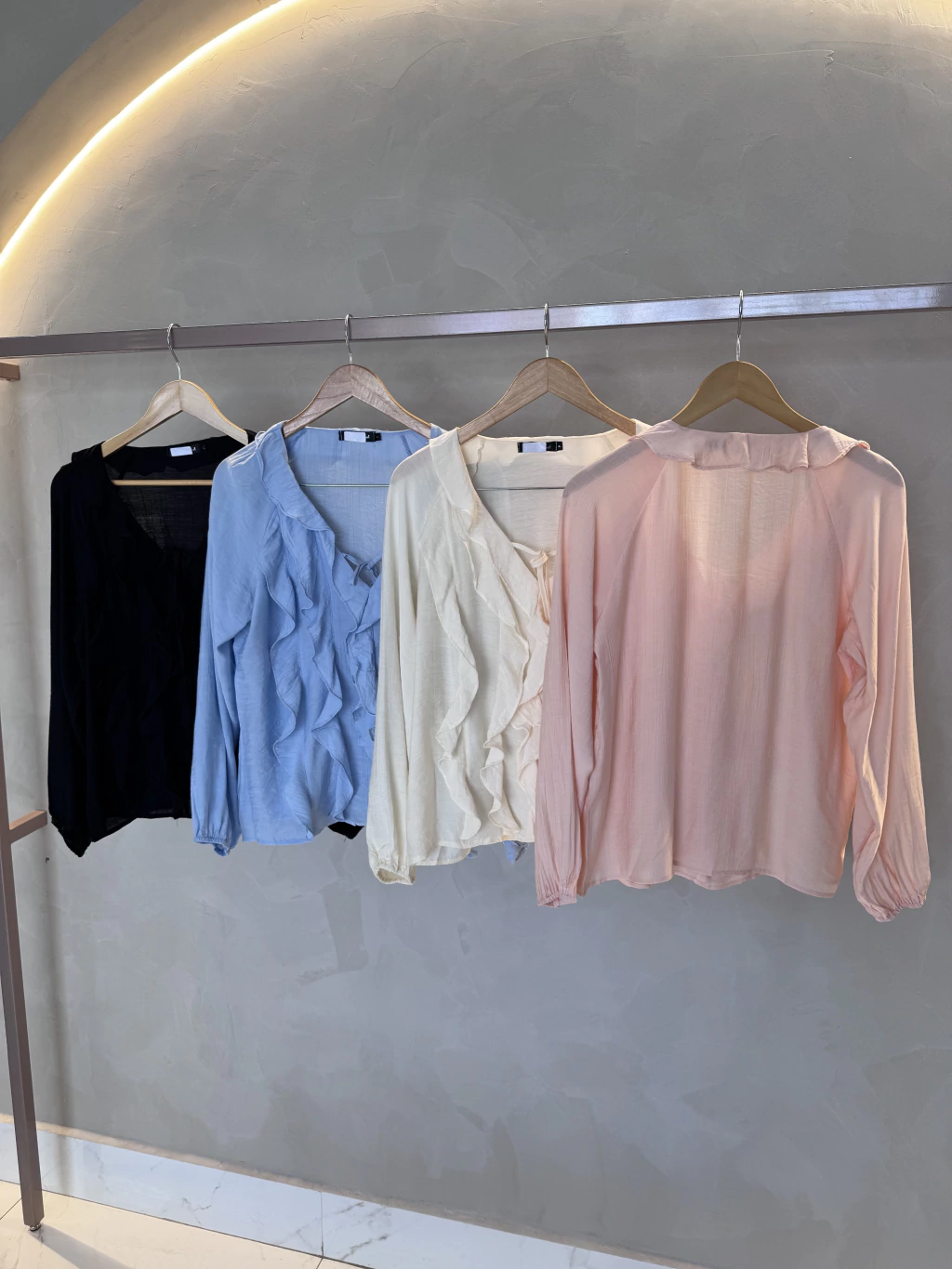 Blusa em tecido viscose de poliéster. Posso babado na parte da frente e amarração nos seios.