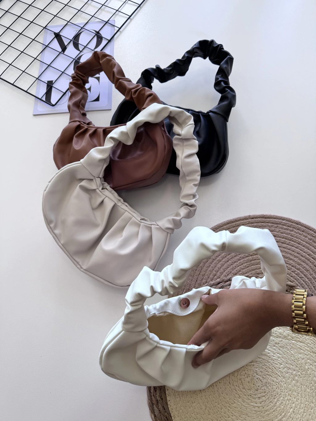Bolsa em tecido couro sintético. Alça e fixa na bolsa