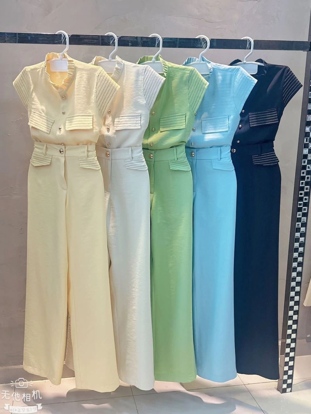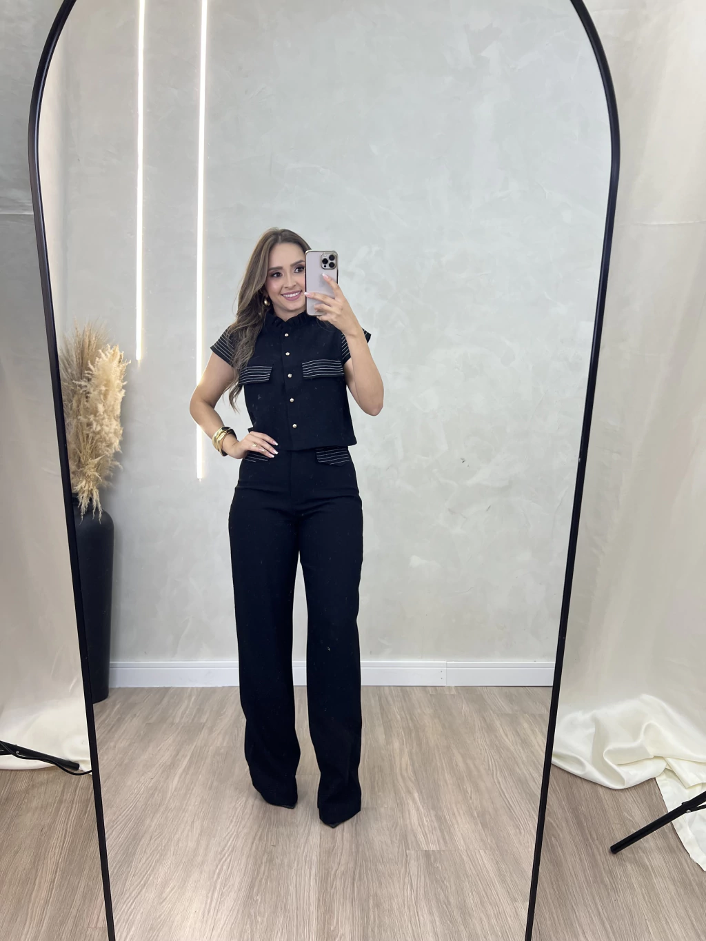 Conjunto em tecido barbarella. Possui detalhes em bolso fake.