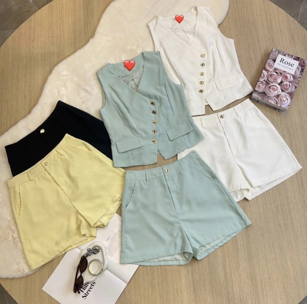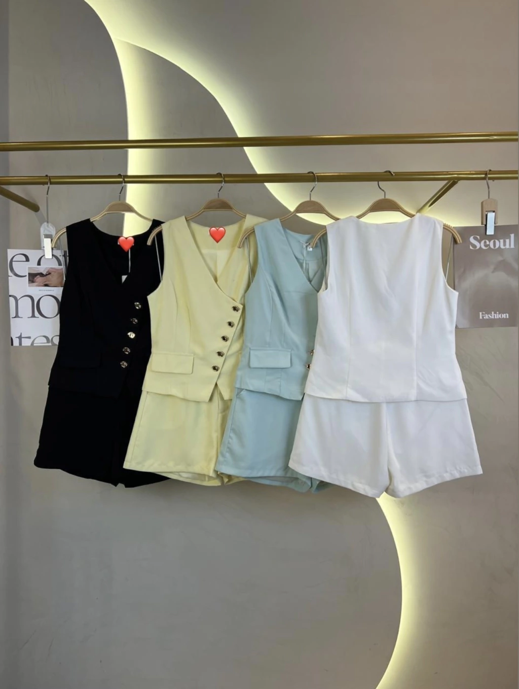 Conjunto colete a em tecido alfaiataria premium. Short possui bolso faça.
