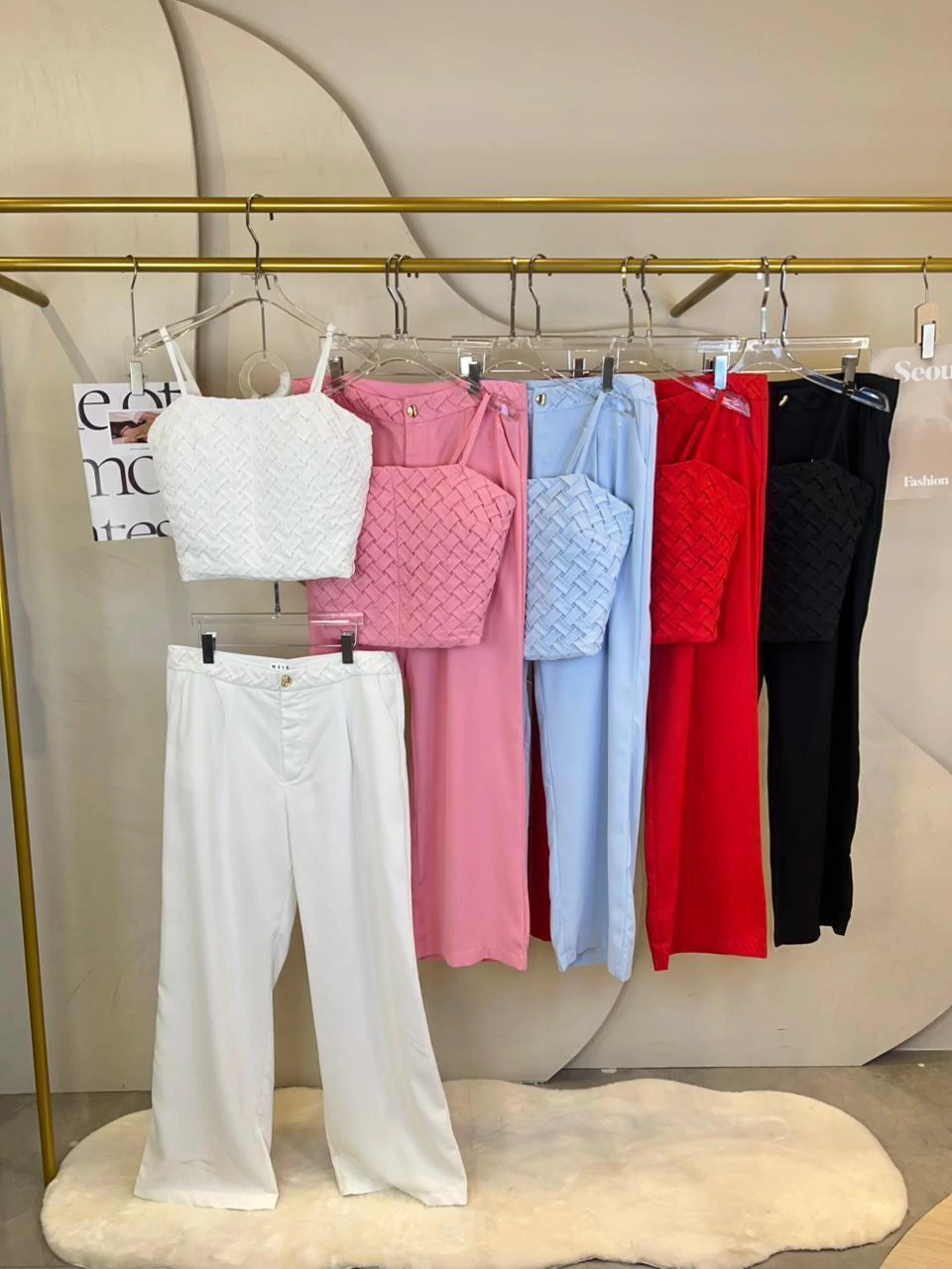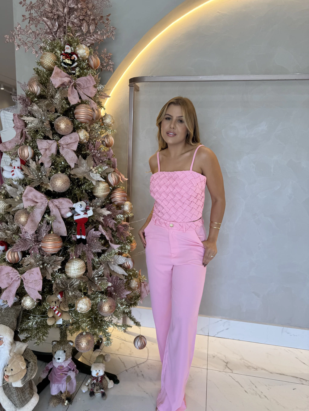Conjunto em tecido alfaiataria premium, modelo de calça alongada.