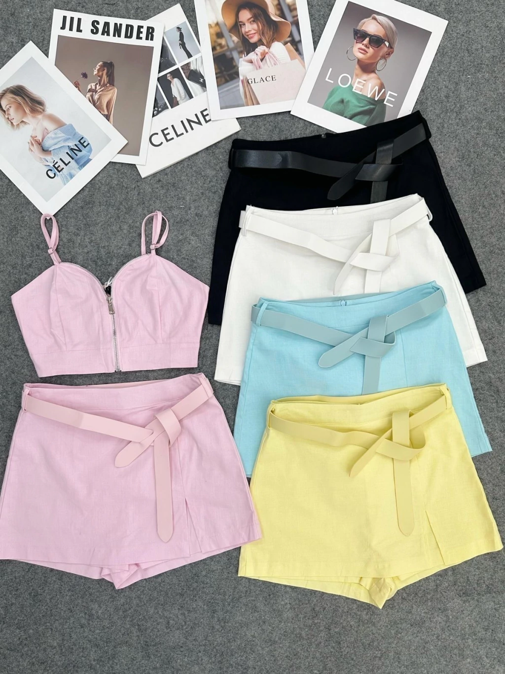 Conjunto em tecido linho , alta custura , tecido com elastano . Com short interno .