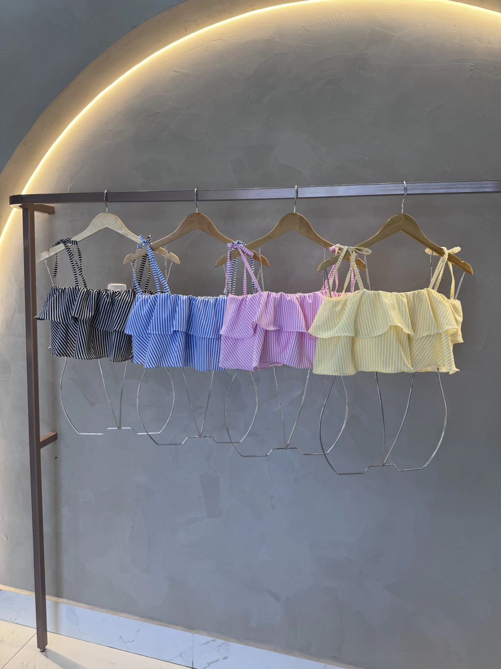 Cropped em tecido crepe alfaiataria, possui alcinha fina para fazer amarração no ombro.