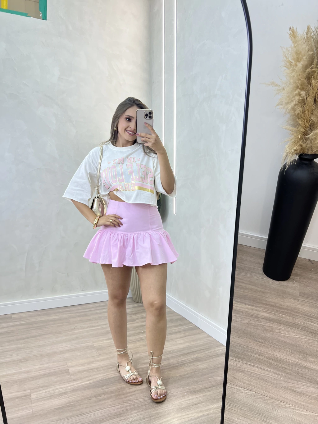 Mini short saia em algodão com detalhe de babados na barra, cós intermediário e zíper invisível lateral.