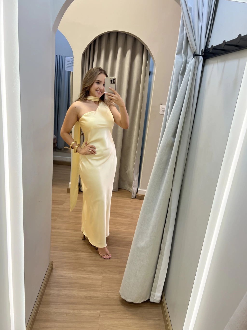 Vestido Julia: tecido cetim. Possui zíper na lateral. Não possui bojo.