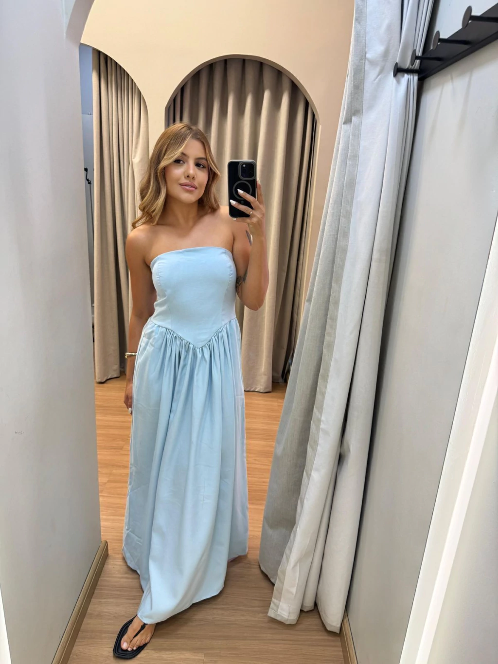 Vestido em tecido Amarrant. Possui bojo e elástico na parte das costas, transmídi elegância e fluidez.