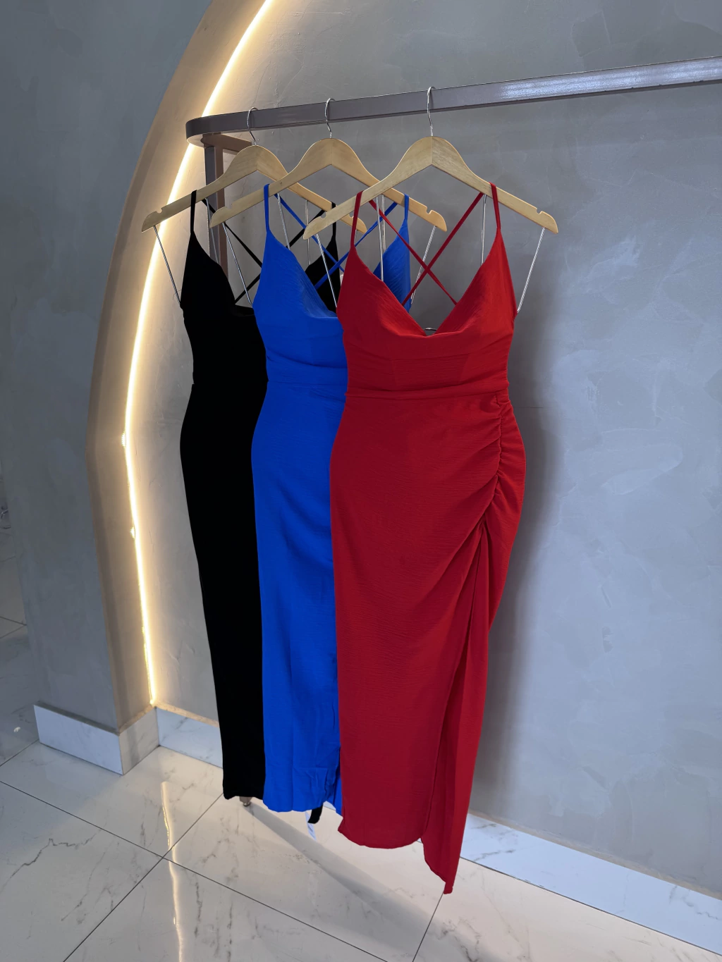 Vestido em crepe , forrado , com drapeado , possui Costa nua .