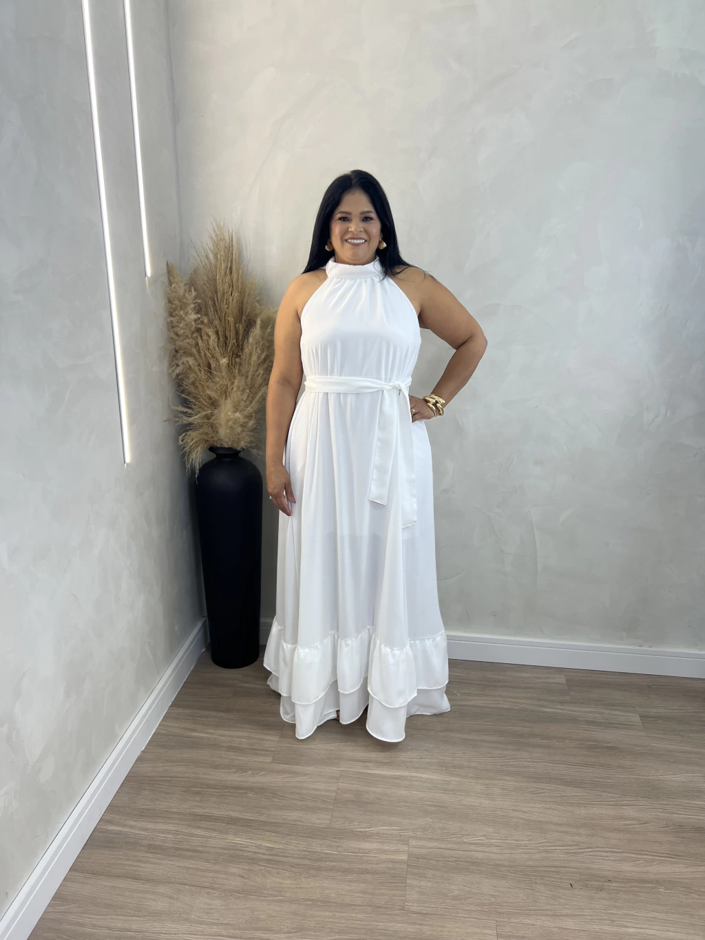 Vestido em tecido crepe. Não possui bojo, e amarração nas costas. Forro interno. Caimento perfeito no corpo.